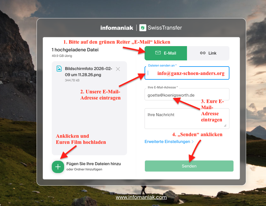 Bitte schickt Eure fertigen Filme, Einverständniserklärung und Filmeinreichformular mit dem kostenlosen Onlinedienst Swisstransfer (Anleitung Swisstransfer) oder sendet uns einen Download-Link an die E-Mail info@ganz-schoen-anders.org.