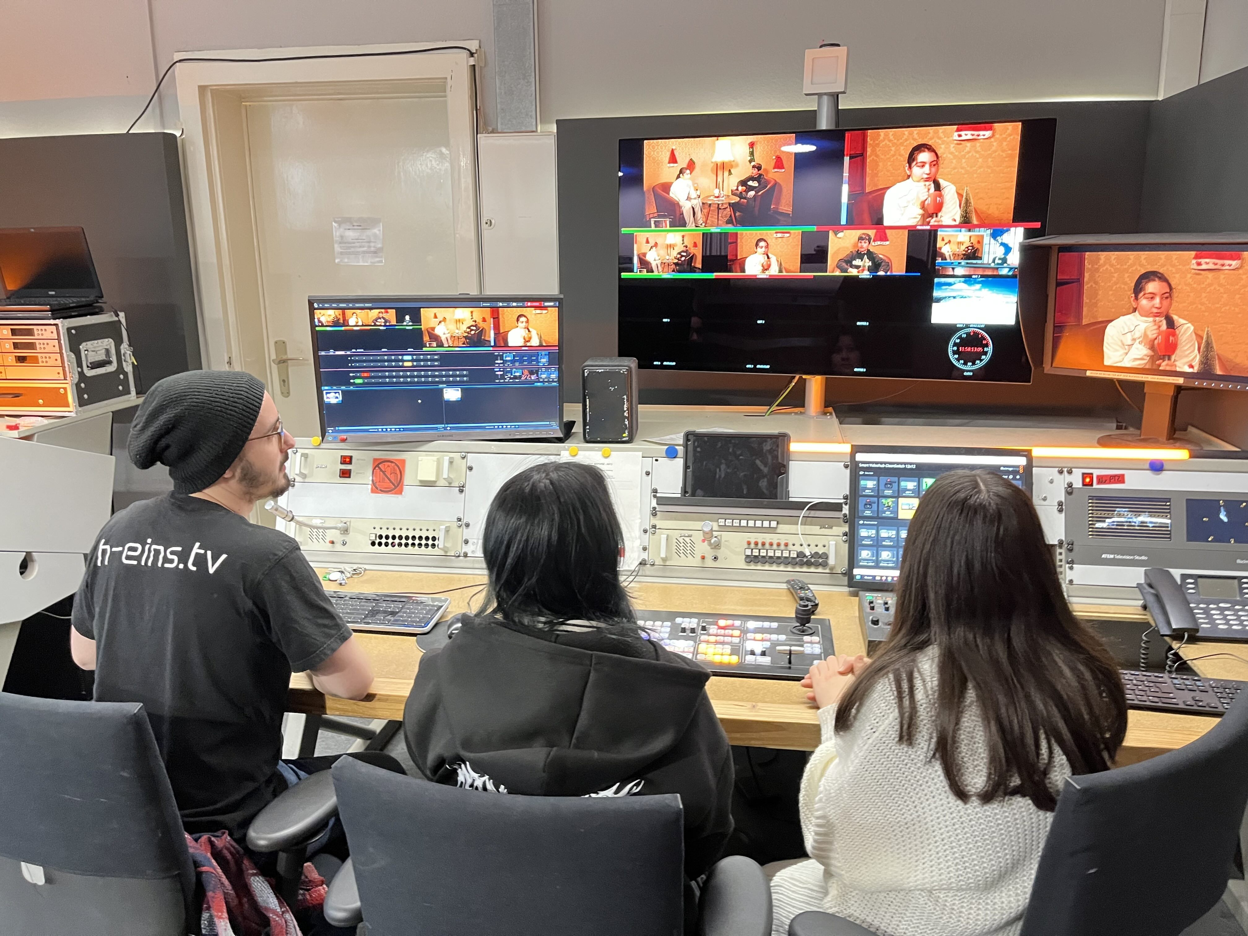 Neben Filmschnitt und Vertonung, Lego-Musikvideo und Trickfilm mit Papier gibt es auch eine Station, die heute für Staunen sorgt: das magische Fernsehstudio. Das befindet sich um die Ecke vom Künstlerhaus bei h1 – Fernsehen aus Hannover, Kooperationspartner des inklusiven Kurzfilmtags. Eine große Greenscreen-Leinwand dominiert den Raum. Davor sitzt ein Jugendlicher an einem einfachen Tisch – in der fertigen Szene ist der Jugendliche schließlich Moderator in einem futuristischen Fernsehstudio. Gleich soll es um die besten Spiele-Geschenkideen zu Weihnachten gehen. Zwei Schüler*innen übernehmen die Rolle von Spielexperten und Journalistin führen vor laufender Kamera ein Fachgespräch.